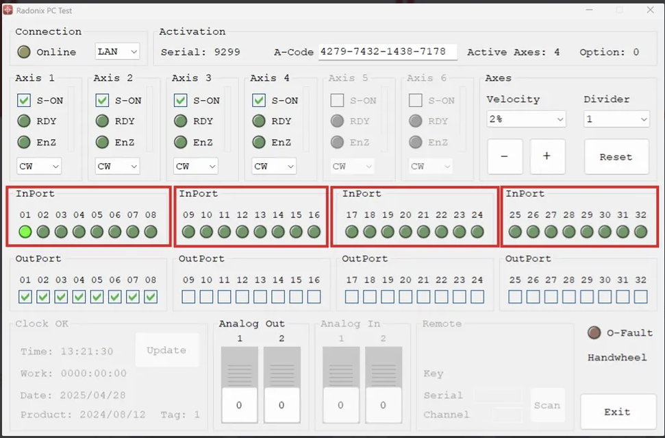 Digital Inputs (DIs) are 24 V sensor lines that tell the Radonix controller what the machine is doing. Each DI is linked—under Settings ► Inputs—to a name such as HomeX1, Emergency, or ClampSensor.When the connected switch or sensor goes HIGH, the controller instantly updates its logic (stop, home, interlock, etc.). All DIs are fail-safe: if the signal drops during a cycle, Radonix halts motion and raises an alarm. You can watch every DI live or force-invert its logic in the Diagnostics panel to confirm correct wiring.