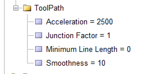 Software programs that convert motion paths into G-code usually simulate curved paths using line segments. There are angles between these lines, and based on these angles, the length of the lines, and the motion acceleration defined for the ToolPath, the maximum speed allowed for passing these intersections is calculated. This variable is actually a coefficient that is multiplied by the calculated maximum speed.