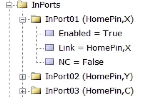 is the identifier for the pin number of the digital inputs of the controller. The variable “Enabled” is defined as True or False. If this variable is False, the input port in question is generally deactivated and ignored. If this variable is True, the input port in question is activated and can be used according to the designated link.