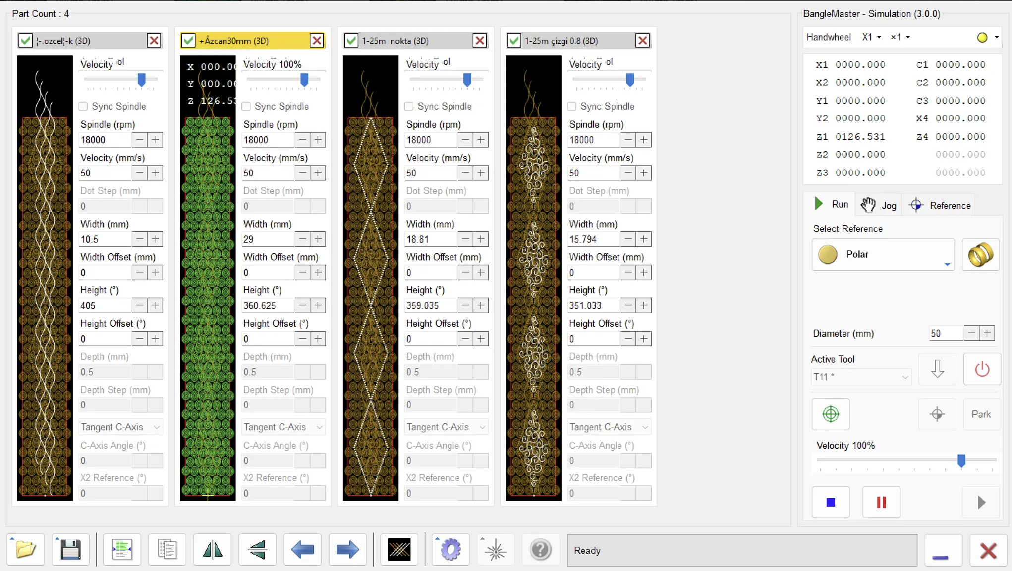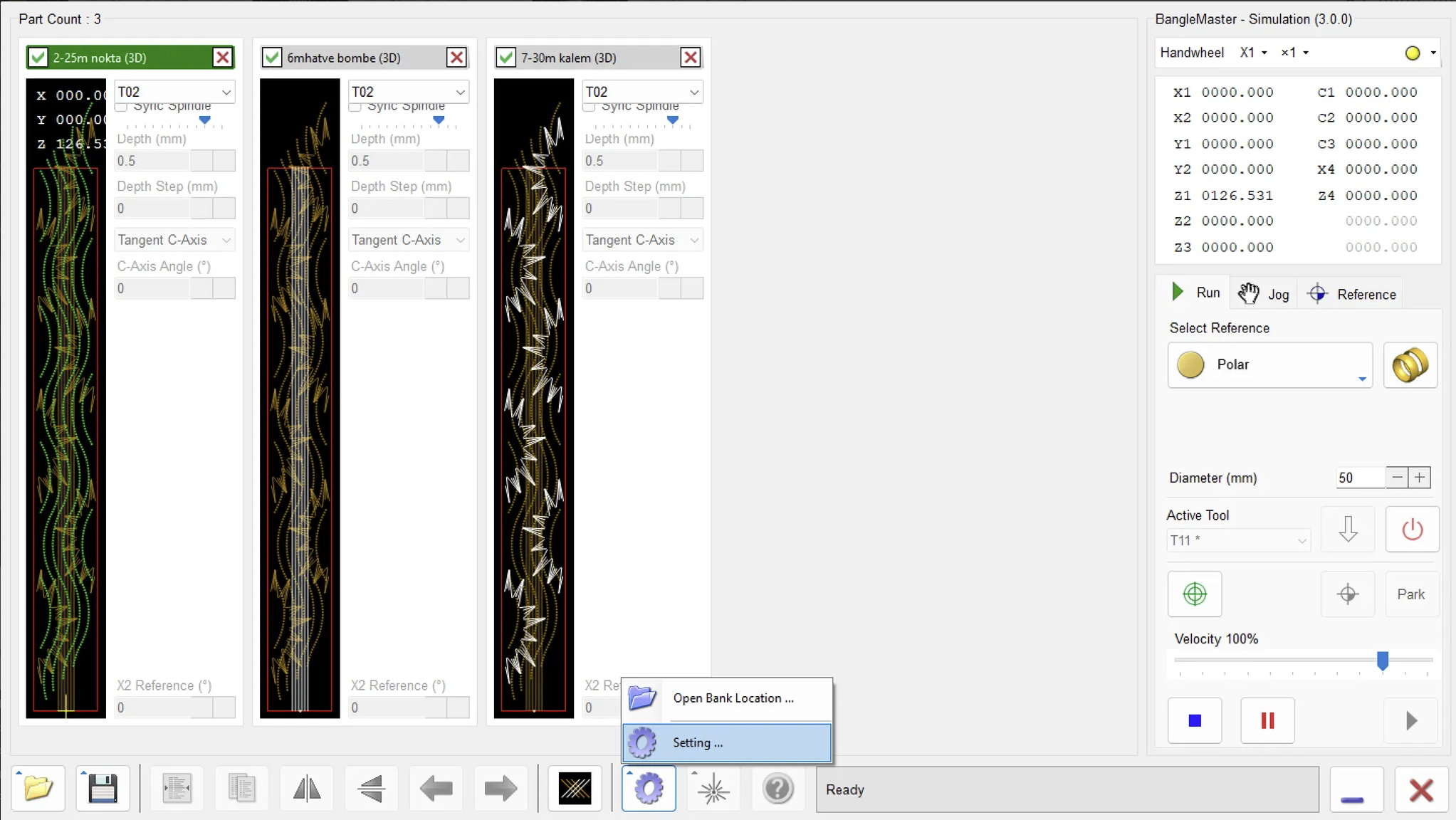 - **Introduction **The BangleMaster Simulation Interface developed by Radonix allows jewelry manufacturers and designers to simulate toolpaths and machine operations before executing them on an actual CNC or lathe. While the software focuses primarily on bangle production, the same principles apply to a wide range of jewelry manufacturing processes — including rings, pendants, and ornamental components.