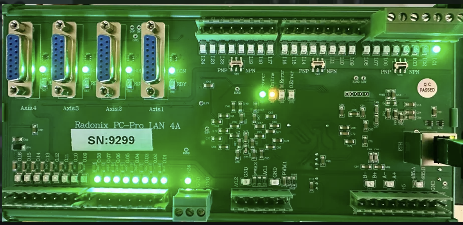 This totals 8 individual axes, which can be expanded through X4 boards to meet even more complex mechanical layouts. Whether the machine operates synchronized tool heads or rotary indexing spindles, Radonix controllers ensure smooth, deterministic motion and reliable process control.
