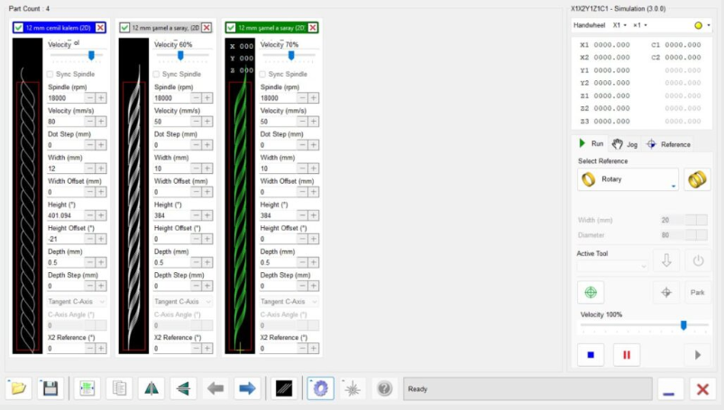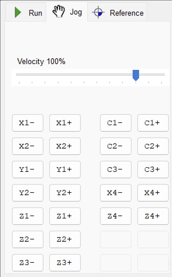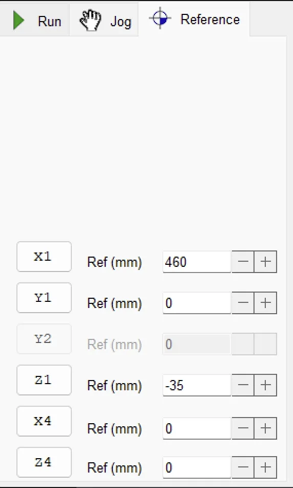 - Reference: Clicking this will send all axes to their machine-zero positions. Always reference before your first job to ensure accurate coordinate alignment.