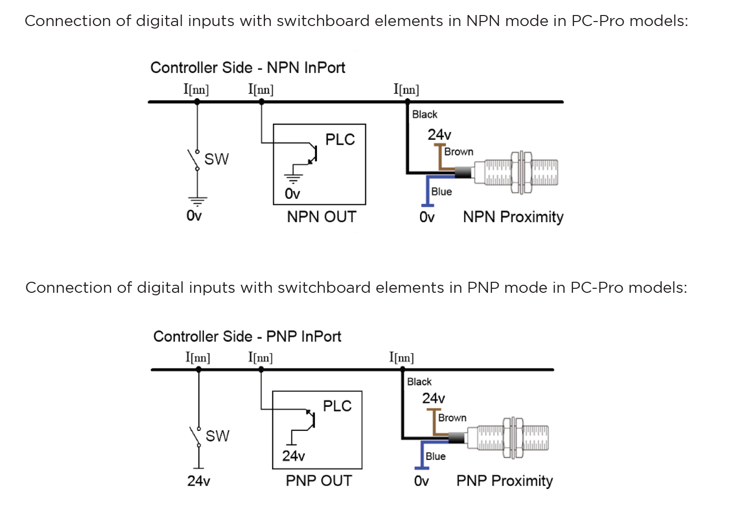 The digital inputs on Radonix controllers have the capability to switch between NPN and PNP modes depending on the output of the device or sensor. The mode changeover switch must be set to PNP position for devices with PNP output and NPN position for devices with NPN output.