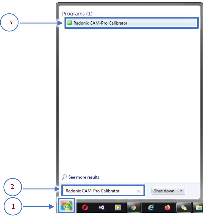 As explained in the previous section, the CAM-Pro Calibrator software is installed alongside the CAM-Pro software. There are two methods to locate the calibrator software after installation. According to the first method, simply go to the installation location, which by default is on the C drive of Windows. Then navigate to the 'Program Files (x86)' folder, open the Radonix folder, and you will find the Radonix CAM-Pro file where the CAM-Pro Calibrator software can be seen. According to the second method, just use the Search feature from the Start menu (Figure 1, Step 1), search for 'Radonix CAM-Pro Calibrator', and run it