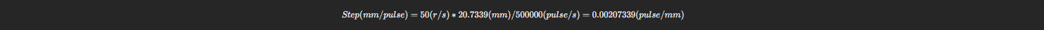 Step (mm/pulse) = 50 (r/s) ∗ 20.7339 (mm) / 500000 (pulse/s) = 0.00207339 mm/pulse