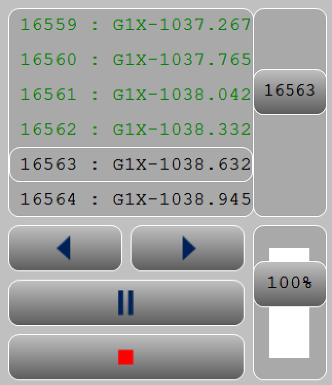 - Backward: The Backward button provides operators the ability to step back within the G-Code toolpath execution process. This feature is essential for troubleshooting, rechecking, or re-executing specific portions of the G-Code.