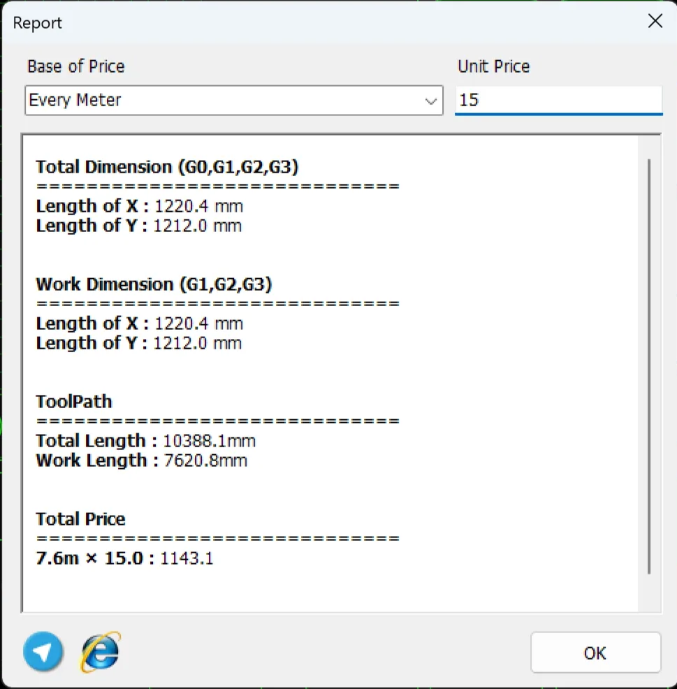 - The $ icon create a report from the workpiece and operator can estimate the price