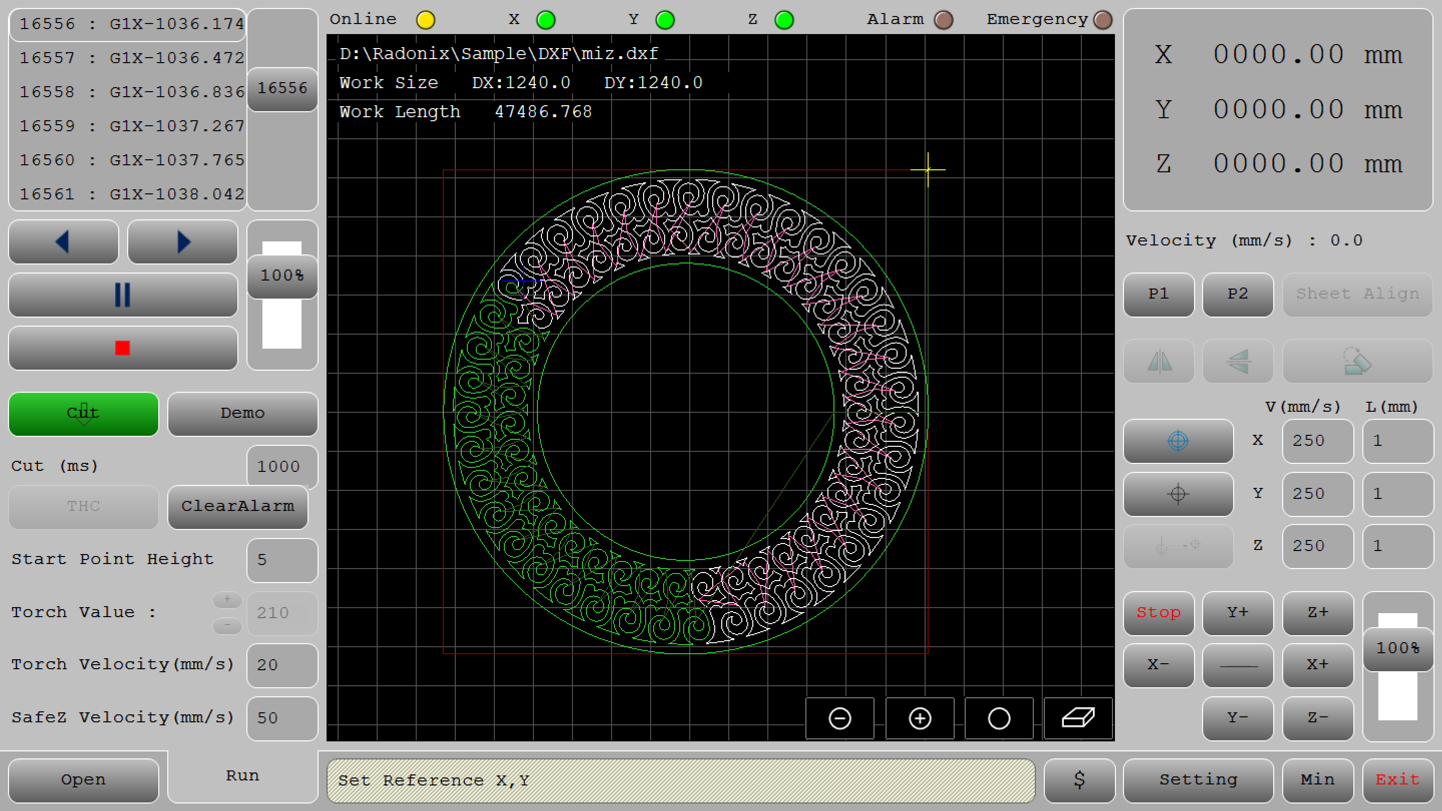 - Velocity (Below Relative Position): Shows the current operational speed in mm/s, useful for monitoring real-time cutting or movement speeds.