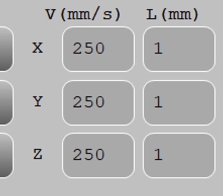 - V (mm/s) and Step**(mm)**: Input fields for setting feed rates and movement limits along each axis. "V" controls the velocity (or speed) in mm/s, and "L" could define the step size for each manual jog.