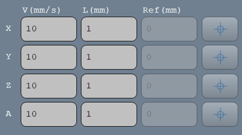 - V (mm/s) and Step**(mm)**: Input fields for setting feed rates and movement limits along each axis. "V" controls the velocity (or speed) in mm/s, and "L" could define the step size for each manual jog.